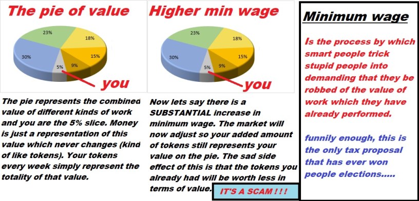 The reaction of the market to this kind of phenomena is always the same and takes the form of hyper inflation, in which the value representation of each token in reduced. The consequences of this are incredibly dire because not only does it lower the value of all the new tokens that are dished out, but also lowers the value of the old ones, which act as a buffer against the new currency dropping as severely as it should do. To summarise my point, welfare systems such as universal basic income and minimum wage not only do not make a difference in buying power per week, but actually rob people of the work that they have already done by devaluing savings.