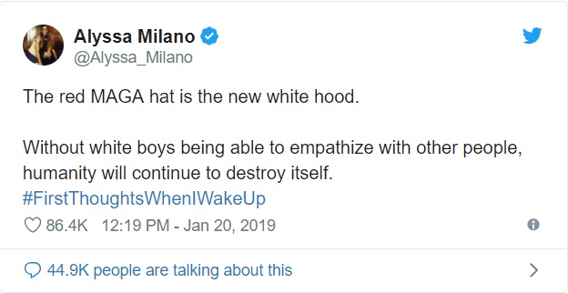 Actress Alyssa Milano seems to share the same sentiment as López comparing the MAGA hat to a racist symbol. She tweeted: