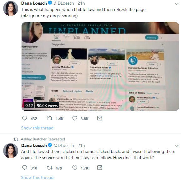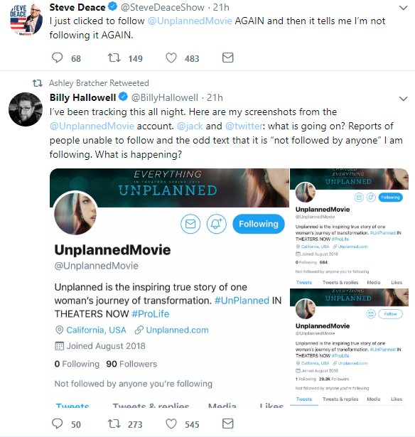 Social media platforms have refused to verify the official Unplanned pages, Instagram being the only one to finally give them a badge. Twitter on the other hand has deleted their page mysteriously and claimed it to be an “error” relating to another account that has nothing to do with Unplanned. After twitter brought back the page they must have not liked the fact Unplanned received a lot of attention after being mysteriously deleted; jumping from 7,000 to over 140,000 subscribers. Suddenly Twitter began to automatically unfollow the Unplanned page from people’s accounts and blocking them from following or finding the page again.